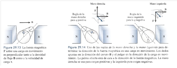 la velocidad v de la carga en movimiento. La palma abierta está de cara a la